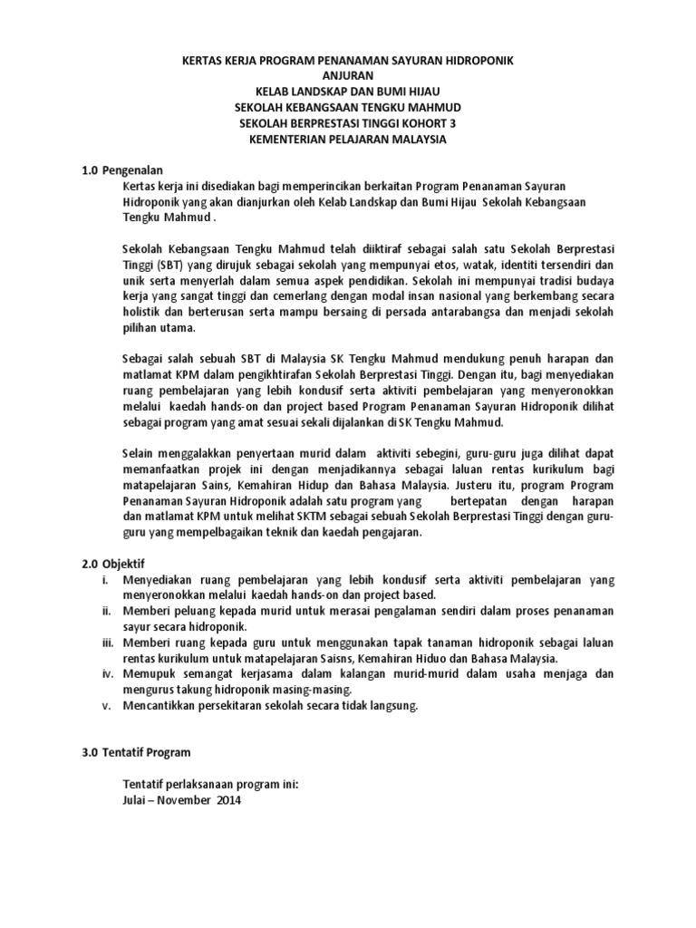 Kertas kerja projek tanaman hidroponik 1tujuan tujuan kertas kerja ini dimajukan adalah untuk memohon peruntukan kewangan untuk membiayai projek tanaman. Kertas kerja program penanaman sayuran hidroponik docx document from. 2OBJEKTIF Projek ini dijalankan dan diusahakan bagi mencapai beberapa objektif seperti berikut.